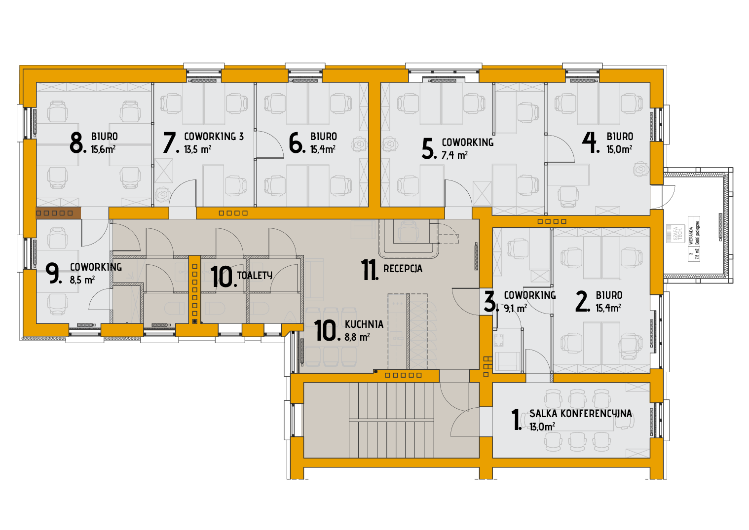 Naszym założeniem jest dostarczenie jakości jaką znamy z zachodnich, kameralnych cowork'ów "all inclusive" czyli: mała recepcja, automat do kawy, duże przeszklenia, zdrowe światło, wygodne krzesła, sprzęty biurowe, rekuperacja powietrza i chłodzenie powietrza w lecie, mała sala konferencyjna, karty kontroli dostępu i monitoring, szafki indywidualne i wiele innych udogodnień.